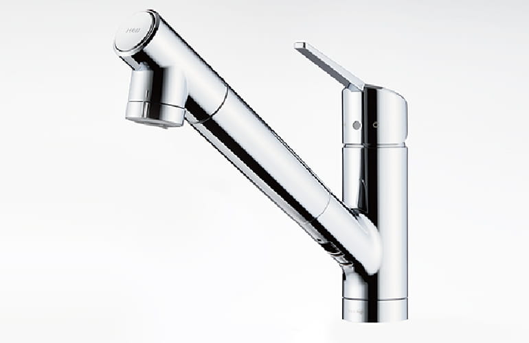 ノズルが引き出せ、浄水器を内蔵したハンドシャワー混合水栓を採用。大きなお鍋やシンクのお手入れに便利です。