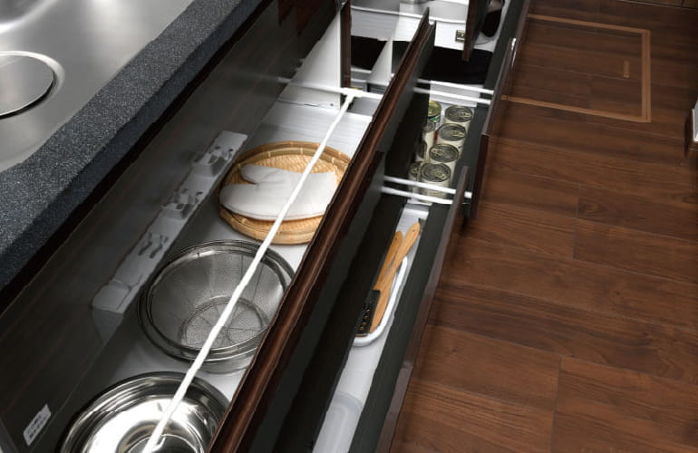 奥までしっかり利用でき、鍋やフライパンなども効率的に収納できます。スライド式で軽く引き出せるので、重い物も安全に取り出せます。