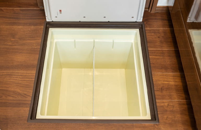 キッチン床下収納を全邸に設置。調味料などの細々とした物や食品ストックを収納できて、キッチン周りがすっきり片付きます。