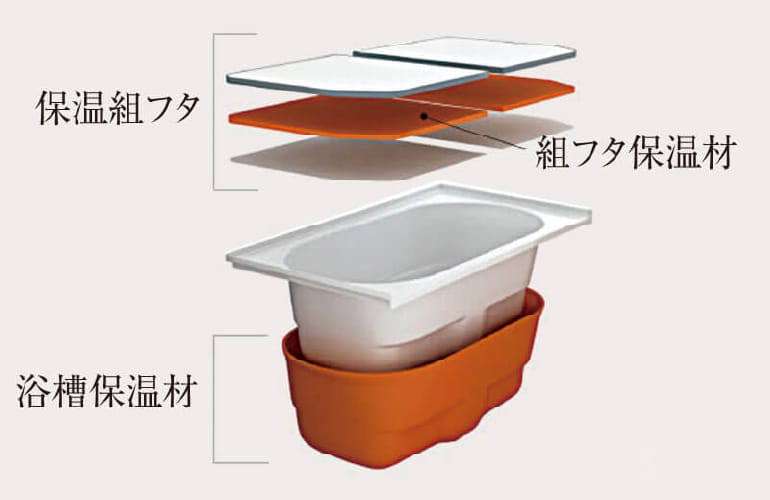 浴槽保温材と保温組フタのダブル保温により、浴槽に張ったお湯が冷めにくい構造です。省エネに配慮しながら、心地よいバスタイムをサポートします。