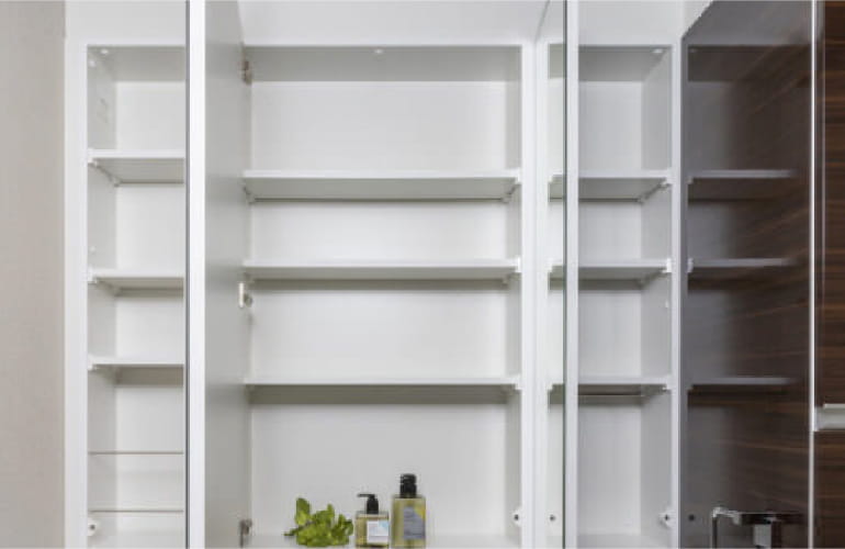 洗面室をスッキリ見せるため、三面鏡の裏側に収納スペースを設置。化粧品や洗面小物などをまとめて収納できます。
