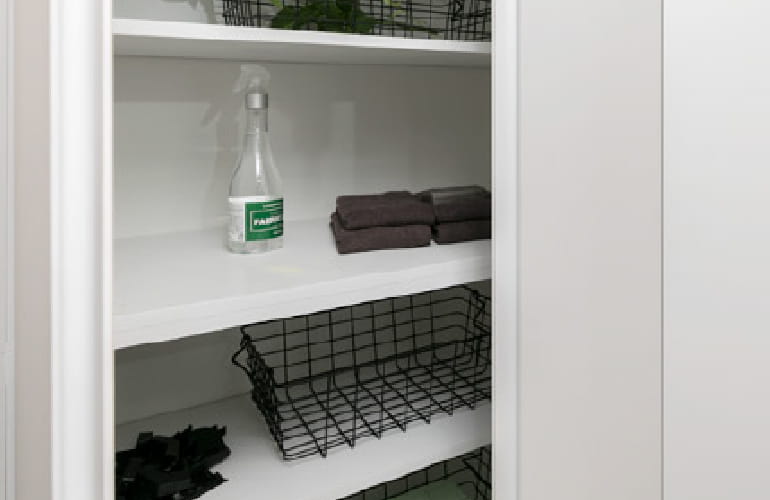 バスタオルやハンドタオル、洗面台周りの小物を収納できる便利なスペースを設置。