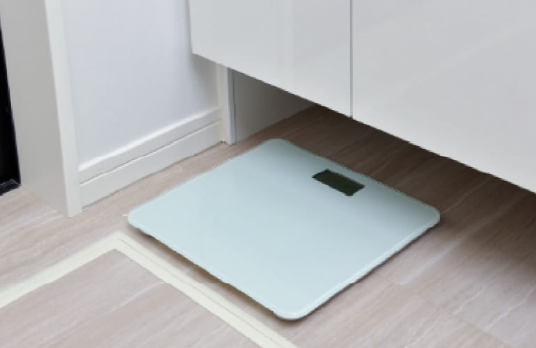 体重計をすっきりしまうことができるスペースを、洗面化粧台の足元に設けています。