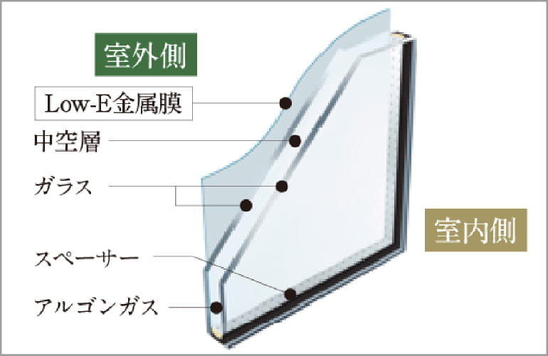 全ての窓にLow-E複層ガラスを採用。夏には太陽の日射熱を抑え、冬は室内の熱が外に逃げにくくなるため、冷暖房効率を高める効果が期待できます。