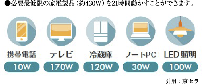満充電の場合、右記の家電を21時間使用可能!※