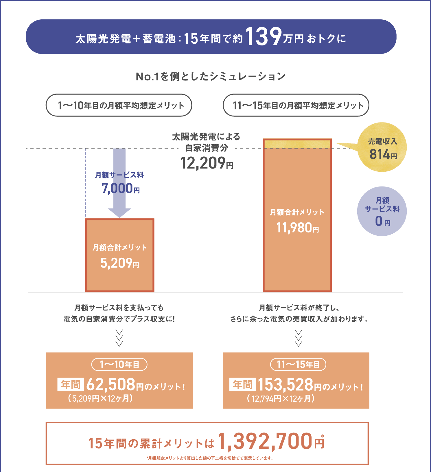 契約期間中の売電収入を東京ガスに譲渡いただくことで、リースサービス等と比較し割安なサービス料を実現しました。初期費用は0円、定額の月額サービス料のみで太陽光発電をご利用いただけます。住戸の販売価格は、機器代金やその他設置費用が上乗せされたものではございません。
