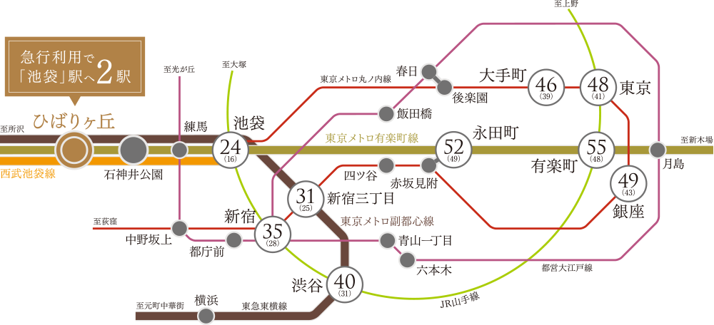 ※「東京」駅:西武池袋線急行利用、「池袋」駅より東京メトロ丸ノ内線乗換え、「銀座」駅:西武池袋線急行利用、「池袋」駅より東京メトロ丸ノ内線乗換え