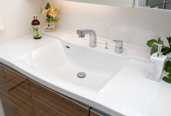 デザイン性に優れたボウル一体型の洗面化粧台。お手入れも簡単です。