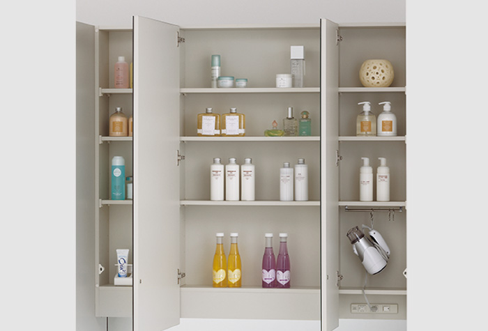洗面室をスッキリ見せるため、三面鏡の裏側に収納スペースを設置。化粧品や洗面小物などをまとめて収納できます。