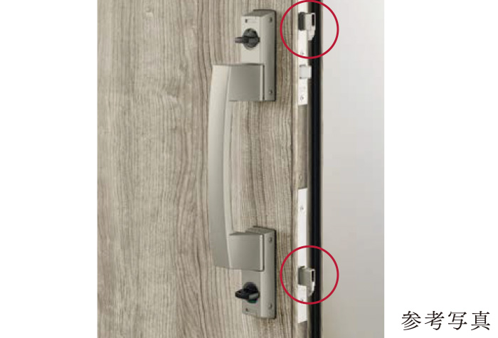 鎌付デッドボルトを2つ装備した強固な玄関ドア。バールなどを使ってドアをこじ開ける手口に対して強い抵抗力を発揮します。