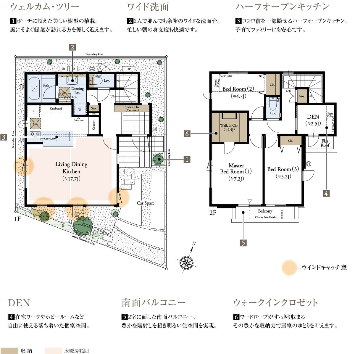 LDや居室の一部にウィンドキャッチ窓を採用。窓を知り尽くした YKK APとともに、外部環境と屋内環境のデータを使ったシミュレーションを重ね、屋外の清々しい風を住まいに効率良く巡らせる室内環境を実現しました。新鮮な空気を取り込むことで、季節を肌で感じるだけでなく、調理・生活臭、ウイルスやアレルギー要因の滞留を抑制します。深呼吸をするように心身に心地よいリズムと彩りを添える、「ウェルビーイング」な暮らしを叶えます。