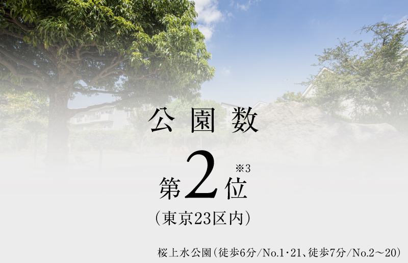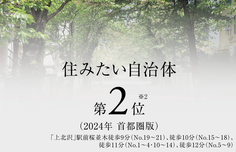 ※2:住みたい自治体ランキング[首都圏版]】株式会社リクルート 2024年2月28日付ニュースリリースより。※3:【公園数[東京23区内]】東京都都市公園等区市町村別面積・人口割比率表(『公園調書』から抜粋)令和5年4月1日現在より。※4:【緑被率[東京23区内]】2021(令和3)年度世田谷区みどりの資源調査報告書(みどりの資源調査)第3章-2より。※5:【人口1,000人あたりの犯罪認知件数[東京23区内]】警視庁令和5年区市町村の町丁別、罪種別及び手口別認知件数より。東京都総務局住民基本台帳による東京都の世帯と人口(町丁別・年齢別) 令和5年1月より