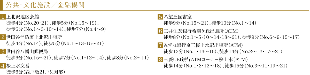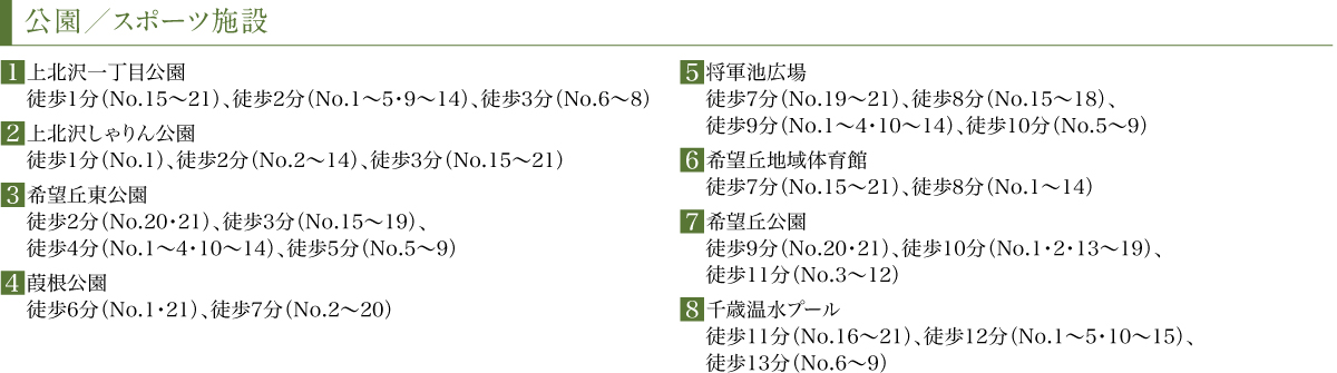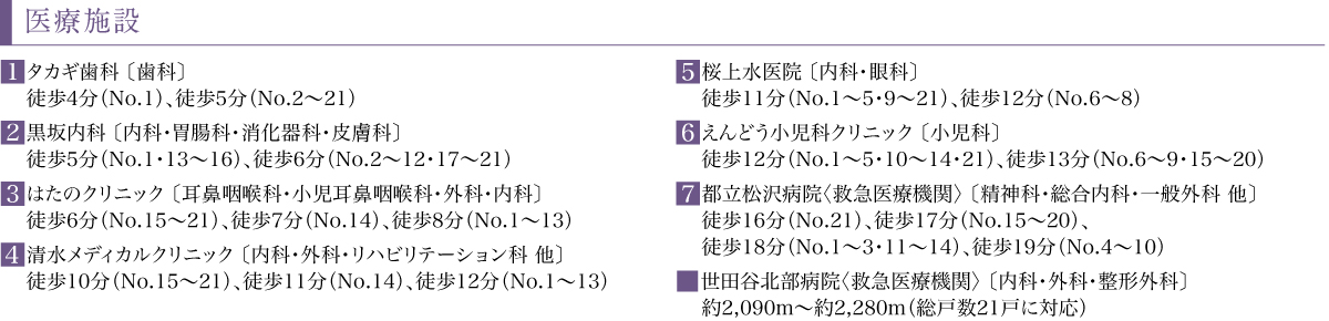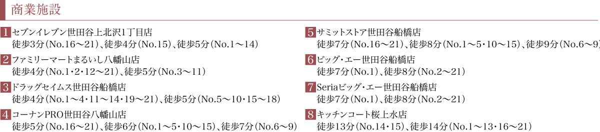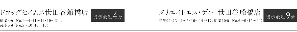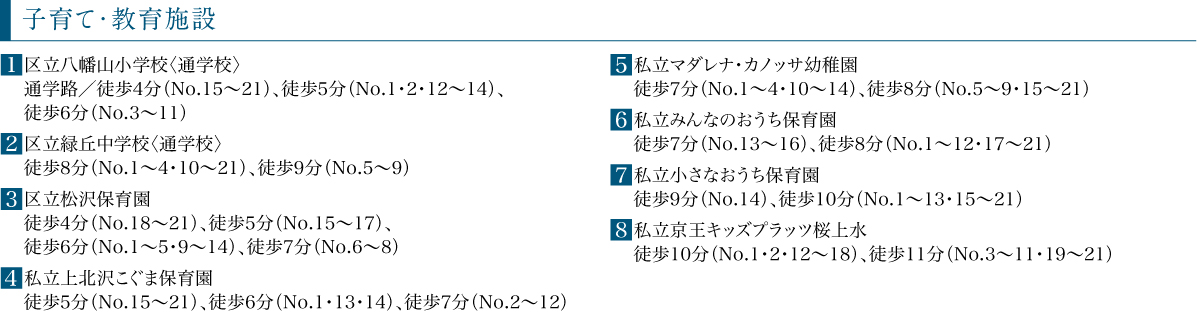 ※1:小田急バス・京王バス「八幡山一丁目」バス停へ徒歩2分(No.15~21)、徒歩3分(No.1・13・14)、徒歩4分(No.2~12)、「経堂」駅へ通勤時バス19分(平日日中バス19分)。「経堂」駅より通勤時バス14分(平日日中バス14分)、小田急バス・京王バス「八幡山一丁目」バス停下車徒歩2分(No.15~21)、徒歩3分(No.14)、徒歩4分(No.1~13)