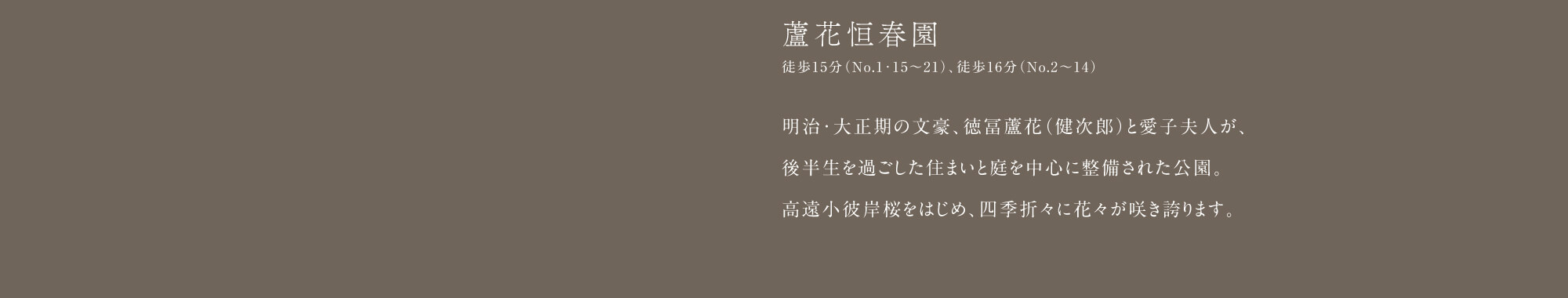 徒歩20分(No.1〜3・12〜14)、徒歩21分(No.4〜11・15〜21)