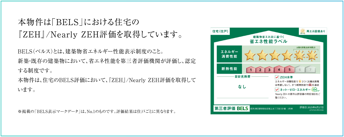 *1:本物件は、経済産業省資源エネルギー庁が定める『ZEH』/Nearly ZEHの定義、<①ZEH(ネット・ゼロ・エネルギー・ハウス)の強化外皮基準Ua値0.60W/(㎡・K)以下(物件の所在エリアの基準値) ②再生可能エネルギー等を除き、基準一次エネルギー消費量から20%以上の一次エネルギー消費量削減 ③再生可能エネルギーを導入(容量不問) ④再生可能エネルギー等を加えて、基準一次エネルギー消費量から100%以上(『ZEH』)/ 75%以上100%未満(Nearly ZEH)の一次エネルギー消費量削減 ※エネルギーに係る設備については、所有者を問わず当該住宅の敷地内に設置されるものとする。>を(『ZEH』:No.1~8・13~21、Nearly ZEH:No.9~12)満たしています。出典:経済産業省 資源エネルギー庁「令和元年度 ZEHロードマップフォローアップ委員会 とりまとめ」「更なるZEHの普及促進に向けた今後の検討の方向性等について」(令和3年3月31日 ZEHロードマップフォローアップ委員会)