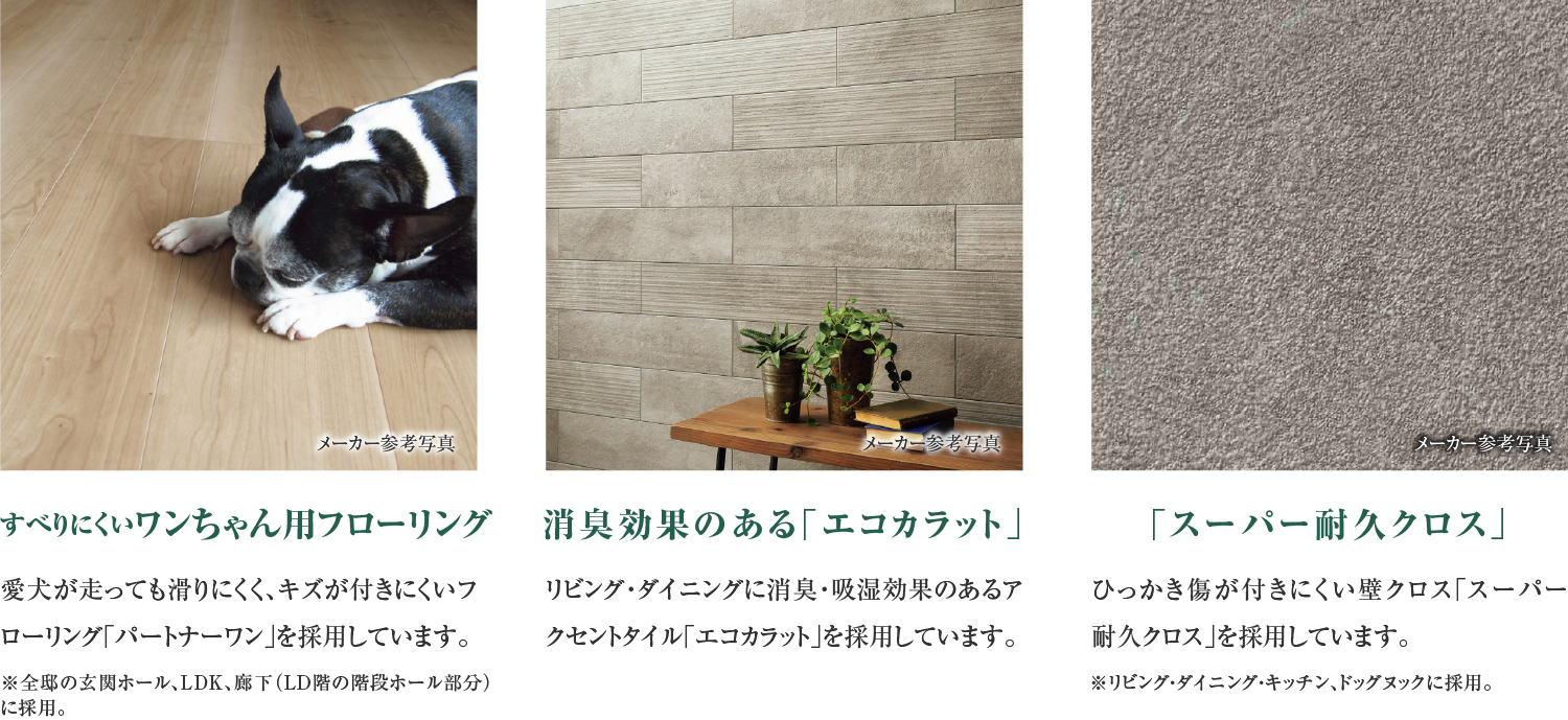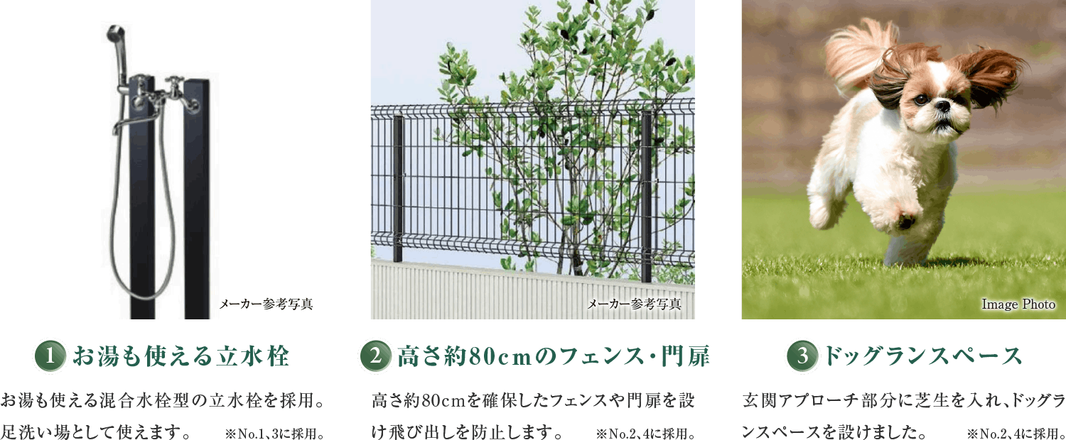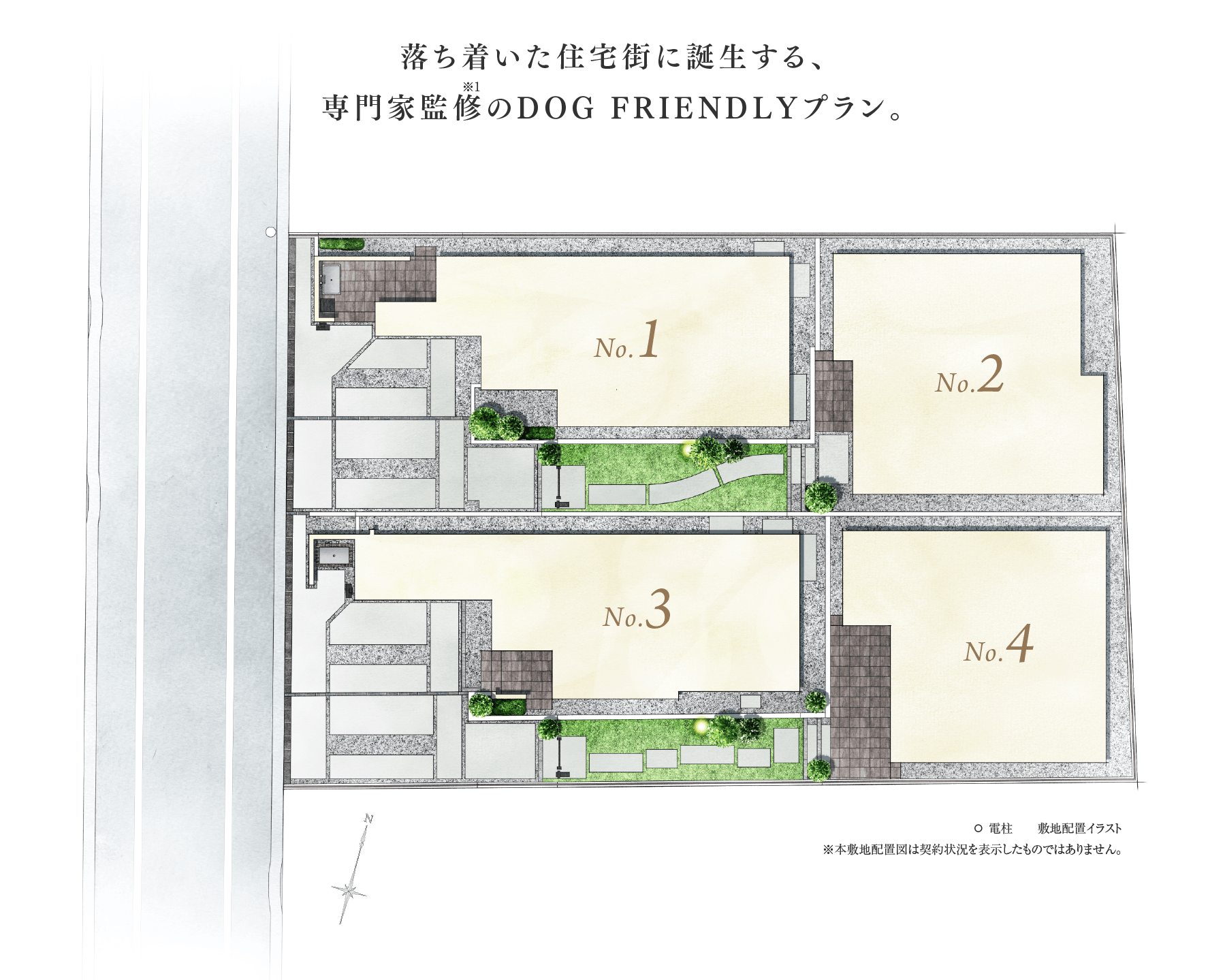 ※掲載の敷地配置イラストは設計図を基に作成したもので、形状・色等は実際とは異なります。外観形状の細部・設備機器等は表現しておりません。表現されている植栽は施工から初期の育成期間を経た状態のものを想定して描いております。施工時は植物の育成を見込んで必要な間隔をとって植えております。家具・調度品は販売価格に含まれません。予めご了承ください。