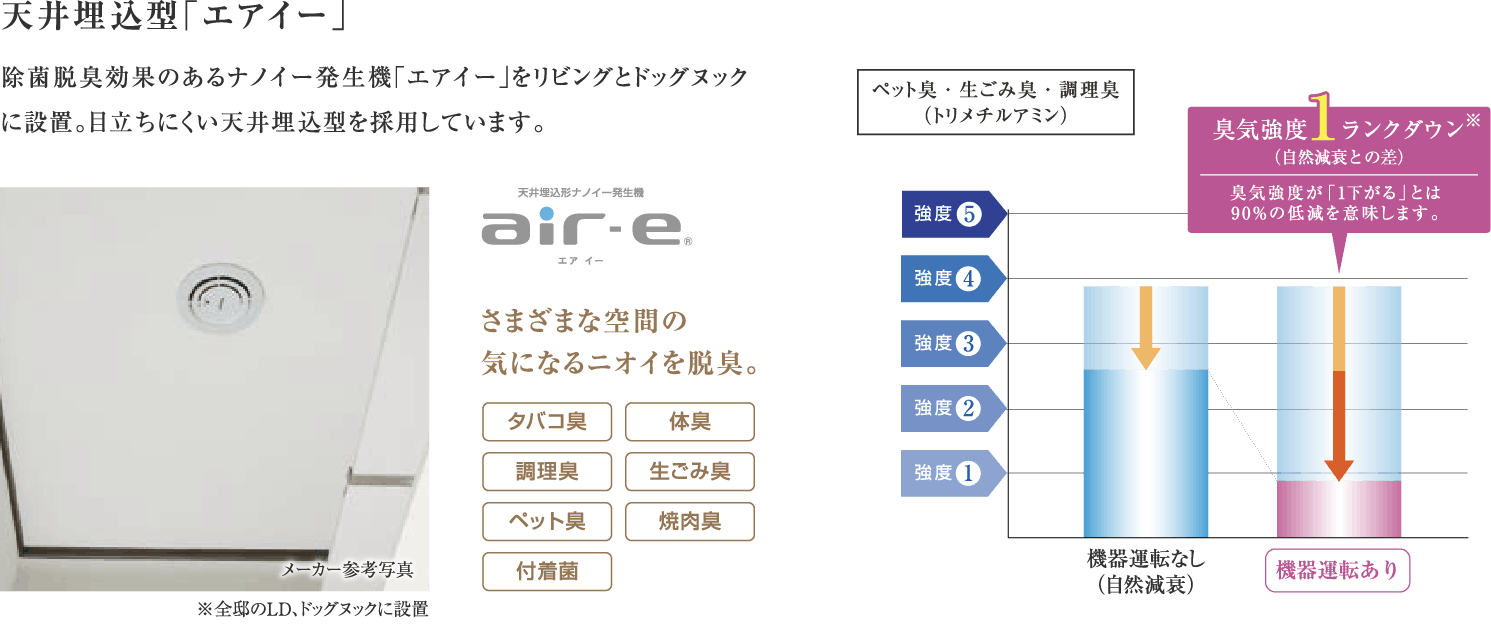 ※脱臭効果は周囲環境(温度・湿度)、運転時間、臭気、繊維の種類によって異なります。また、タバコに含まれる有害物質(一酸化炭素等)は除去できません。常時発生し続けるニオイ成分は、すべて除去できるわけではありません。
