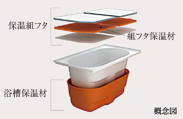 浴槽保温材と保温組フタのダブル保温により、浴槽に張ったお湯が冷めにくい構造です。省エネに配慮しながら、心地よいバスタイムをサポートします。