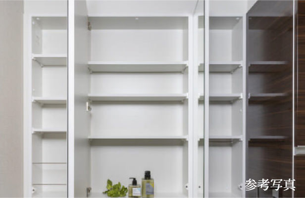 洗面室をスッキリ見せるため、三面鏡の裏側に収納スペースを設置。化粧品や洗面小物などをまとめて収納できます。