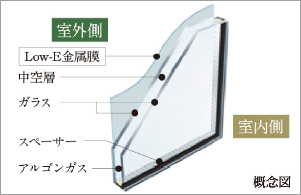 全ての窓にLow-E複層ガラスを採用。夏には太陽の日射熱を抑え、冬は室内の熱が外に逃げにくくなるため、冷暖房効率を高める効果が期待できます。