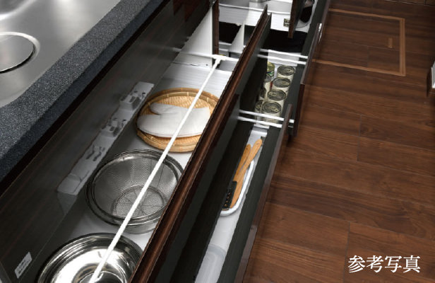 奥までしっかり利用でき、鍋やフライパンなども効率的に収納できます。スライド式で軽く引き出せるので、重い物も安全に取り出せます。