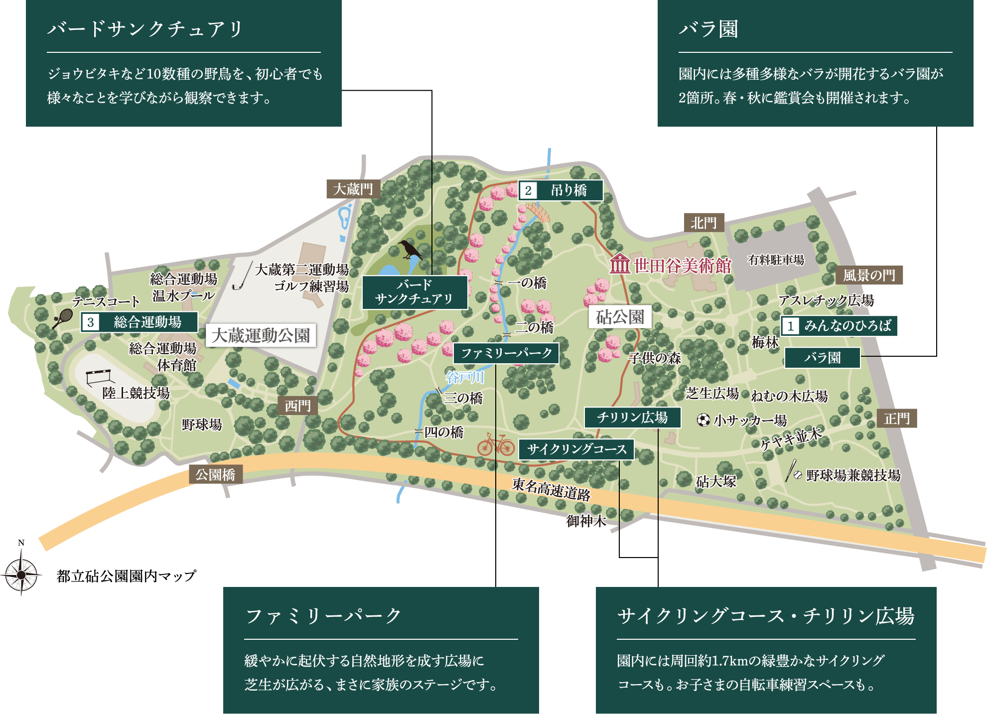 徒歩5分で、足を踏み入れた途端自然の豊かさが壮大なスケールで広がっていく世界へ。東京ドーム8個分・約39万㎡の中に11,000本の高木をはじめとする緑のみならず、水も美も野鳥も伸びやかに息づく都心のオアシスを日常にできます。