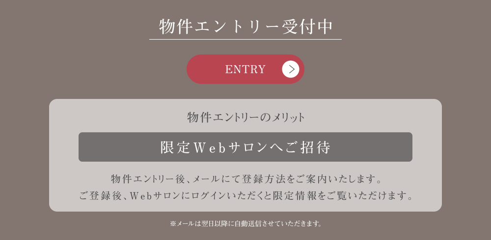 物件エントリー受付中です!エントリー頂いた方は全邸間取りを限定WEBサロンにて閲覧頂けます。