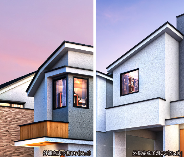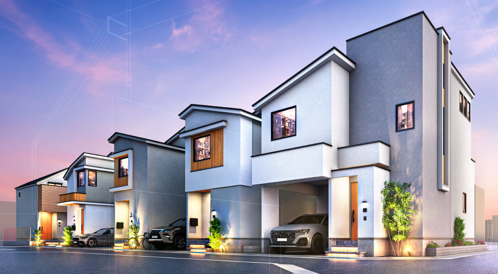 各邸に片流れの屋根形状を採用することで、建物としてのシャープさやボリューム感とともに、横並びの街並みとしての立体感を創出。また、そうしたデザイン性に加え、太陽光パネルの発電効率が高くなるような屋根形状としても計画されています。