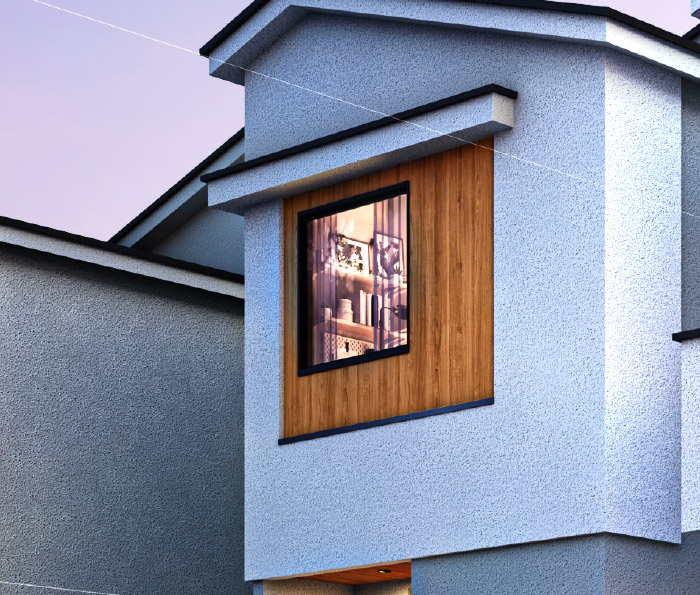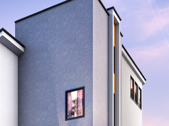 窓廻りや壁の一部に、天然木の豊かな風合いを再現した木調シート「マハール」を採用。白とグレーを基調としたスタイリッシュな外観に映えるアクセントとして、各邸の個性を演出するとともに、周辺の街並みや緑とも調和する温もりのある表情を創出します。