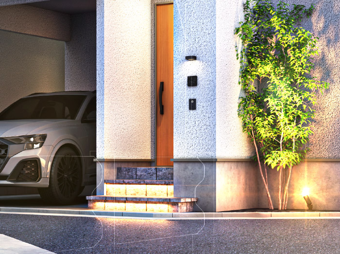 浮き階段の採用により、スタイリッシュな玄関アプローチを演出。間接照明も仕込むことで、迎賓空間としての高級感も高めています。また街区のコーナー部分には、割栗石と約2.5mのシンボルツリーを採用。夜間にはアッパーライトで照らしながら、美しく演出します。