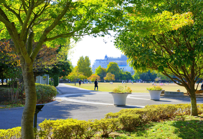 日産自動車の工場跡地に整備された、約4万㎡の広さを誇る「桃井原っぱ公園」。園内には広大な芝生広場をはじめ、ウォーキングやジョギングに最適な遊歩道、せせらぎのある水遊び場、季節の花が楽しめる「四季の広場」などがあります。また、ヘリコプター発着場や備蓄倉庫、非常用トイレなども整備されており、災害時には防災公園としても機能します。