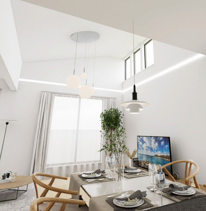 西側ハイサイドに窓を設け、明るく開放的な空間を創出。晴れた日には、豊かな自然光が室内に降り注ぎ、吹抜けの伸びやかさともあいまって、贅沢なまでの開放感に満たされます。
