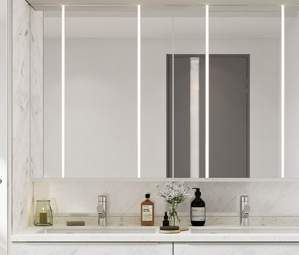 全邸の洗面に、縦型の照明で上から下までムラなく光が当たる「フェイスクリアミラー」を採用。顔に影ができにくいのでメイクの確認にもおすすめ。背の低いお子さまにもしっかり光が当たります。