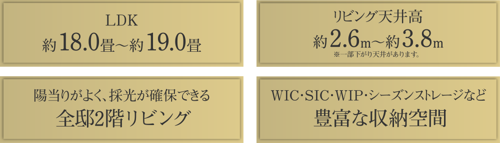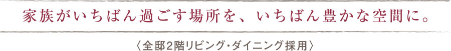 天井高約3.6m以上(※一部下がり天井)の吹抜けを備えた全邸2階リビング・ダイニング。西側ハイサイドの窓から自然光が降り注ぐ、明るく開放感あふれる空間です。もちろん、歩行者の目線も届きにくくプライバシー性も向上。家族がいちばん過ごす場所だからこそ、いちばん豊かな空間に設えました。