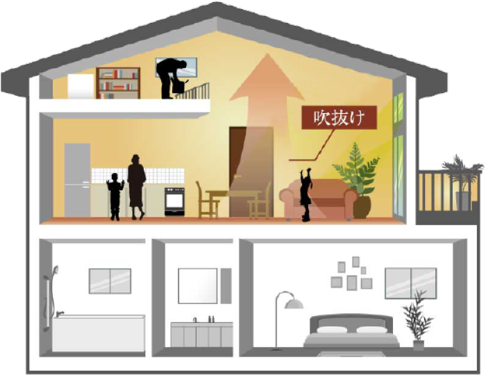 西側ハイサイドに窓を設け、明るく開放的な空間を創出。晴れた日には、豊かな自然光が室内に降り注ぎ、吹抜けの伸びやかさともあいまって、贅沢なまでの開放感に満たされます。
