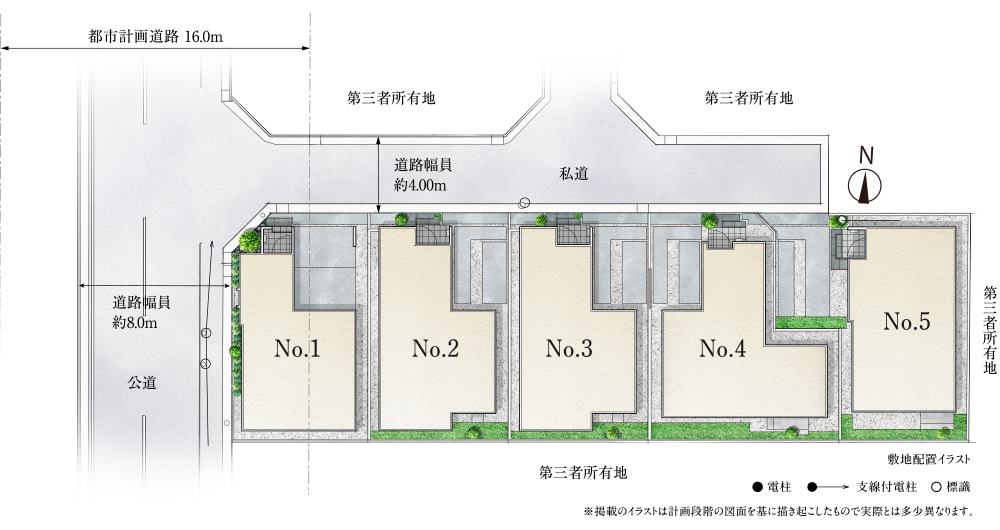 ※掲載の街並み完成予想CGは設計図を基に作成したもので、形状・色等は実際とは異なります。外観形状の細部・設備機器等は表現しておりません。表現されている植栽は竣工から初期の育成期間を経た状態のものを想定して描いております。竣工時は植物の生育を見込んで必要な間隔をとって植えております。家具・調度品等は販売価格に含まれません。予めご了承ください。