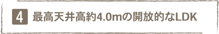 最高天井高約4.0mの吹抜けを採用したリビング・ダイニング。空間としての広さはもちろん、縦方向への開放感も満喫できます。