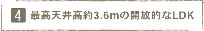 最高天井高約3.6mの吹抜けを採用したリビング・ダイニング。空間としての広さはもちろん、縦方向への開放感も満喫できます。
