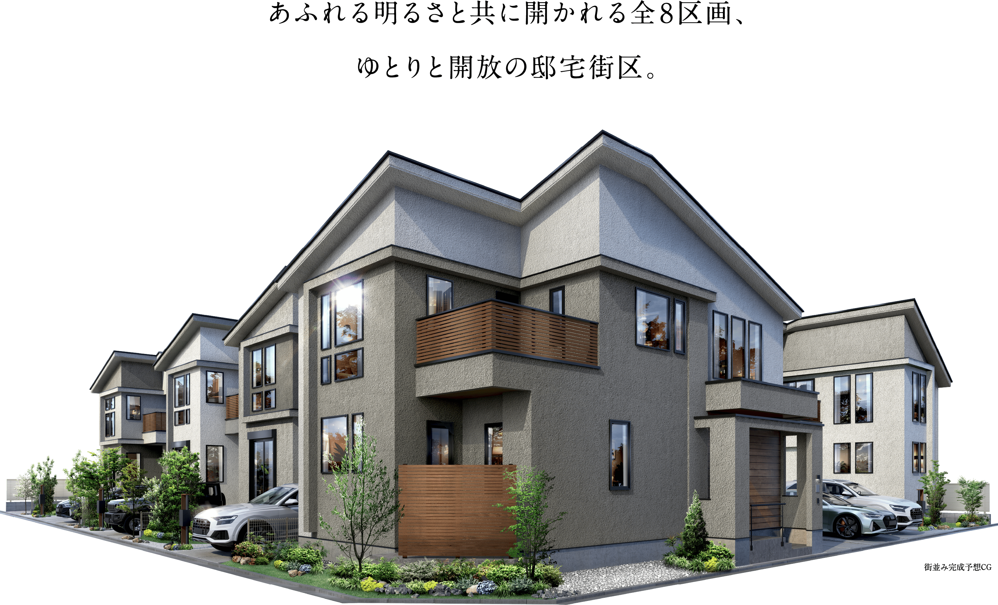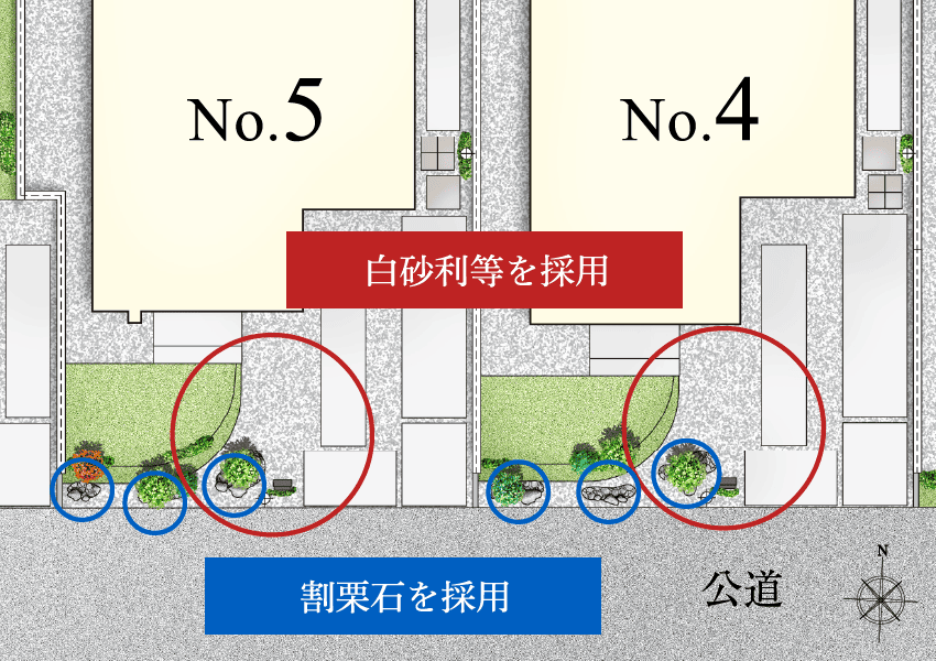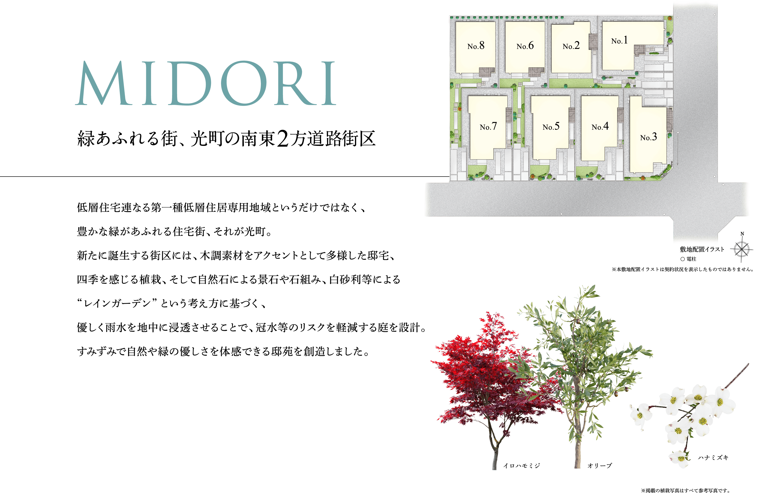 ※掲載の完成予想CGは設計図を基に作成したもので、形状・色等は実際とは異なります。外観形状の細部・設備機器等は表現しておりません。 表現されている植栽は竣工から初期の育成期間を経た状態のものを想定して描いております。竣工時は植物の生育を見込んで必要な間隔をとって植えております。家具・調度品等は販売価格に含まれません。また、本物件の開発敷地内のみを表示しています。予めご了承ください。※掲載の敷地配置イラストは、計画段階の設計図を基に描き起こしたもので、実際とは異なります。