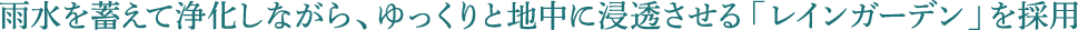 「レインガーデン」とは、豪雨時の排水管の負担軽減や水質改善などの効果が期待できる、地球環境や生活環境を見据えた考え方。白砂利や割栗石などを用いて、その発想を庭園としての美しさも表現できるように設計しました。