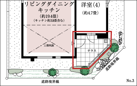 No.3にはリビングと一体的にアウトドアでの団欒や朝日を感じ、ブランチ等を愉しめるテラスを設置。思い思いの演出を楽しめるスペースです。