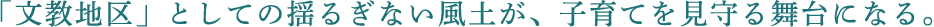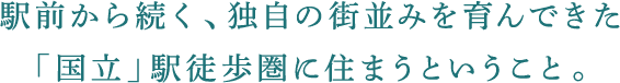 「文教地区」としての深い愛情に支えられながら、揺るぎない学びのための風土を形成してきたのが国立駅周辺のまちづくり。個性的で魅力ある教育施設が揃うだけではなく、その風土を愛する方が集う街で暮らすことが、なによりお子さまの資産となります。