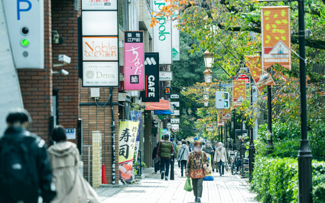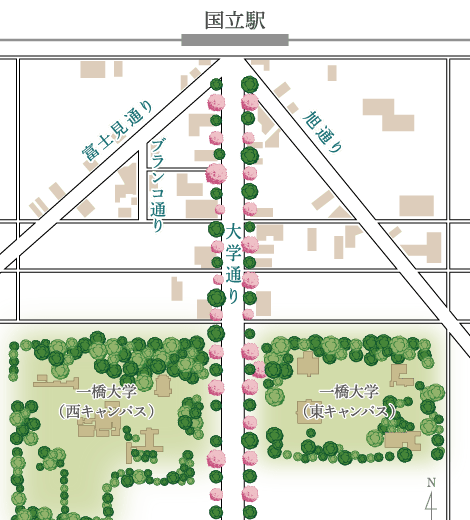 JR中央線「国立」駅の象徴といえば、幅約44mもの車道と両側に約3.6mのゆったりとした歩道、そしてその緩衝帯として幅9mものグリーンベルトが設置されている大学通り。グリーンベルトには約160本の桜と約120本の銀杏が植樹され、冬季はイルミネーションで演出されます。この景観こそ、東京都で初めて「文教地区」に指定されたこの地の象徴であり、その風景は「新東京百景」にも選定されています。