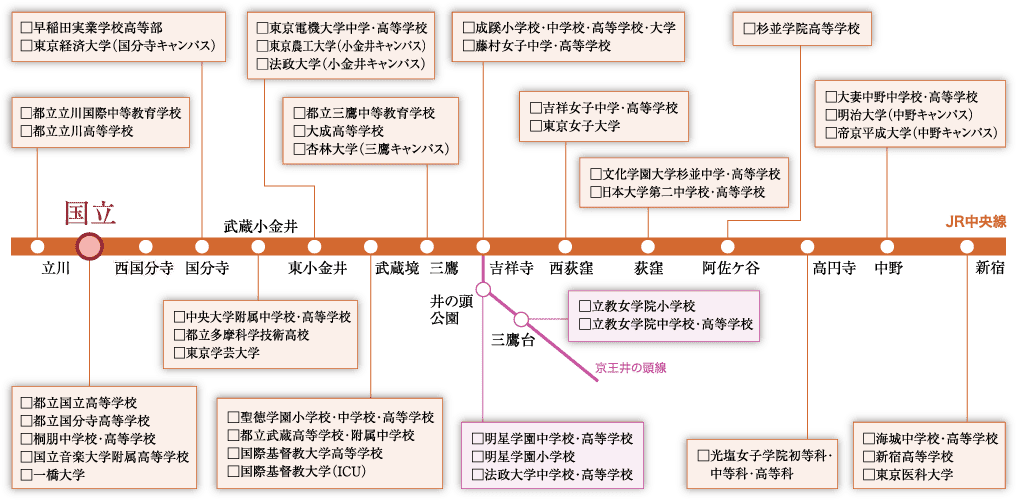 市民の熱意により「文教地区」を形成した国立には、その想いに応え続けてきた学園が揃っています。自主性を尊重する小中高一貫の桐朋学園小学校・中学校・高等学校、高度な音楽教育を実践する国立音楽大学附属高等学校(音楽科)、また都立高校において群を抜く進学実績を誇る都立国立高等学校。情操教育から高等教育まで、幅広い学園が集っている街です。