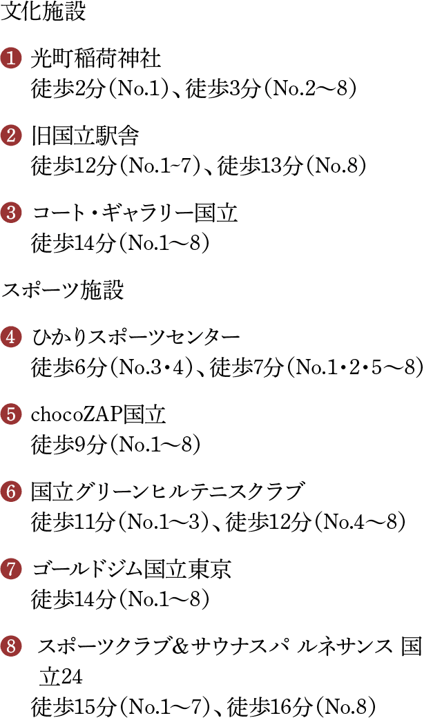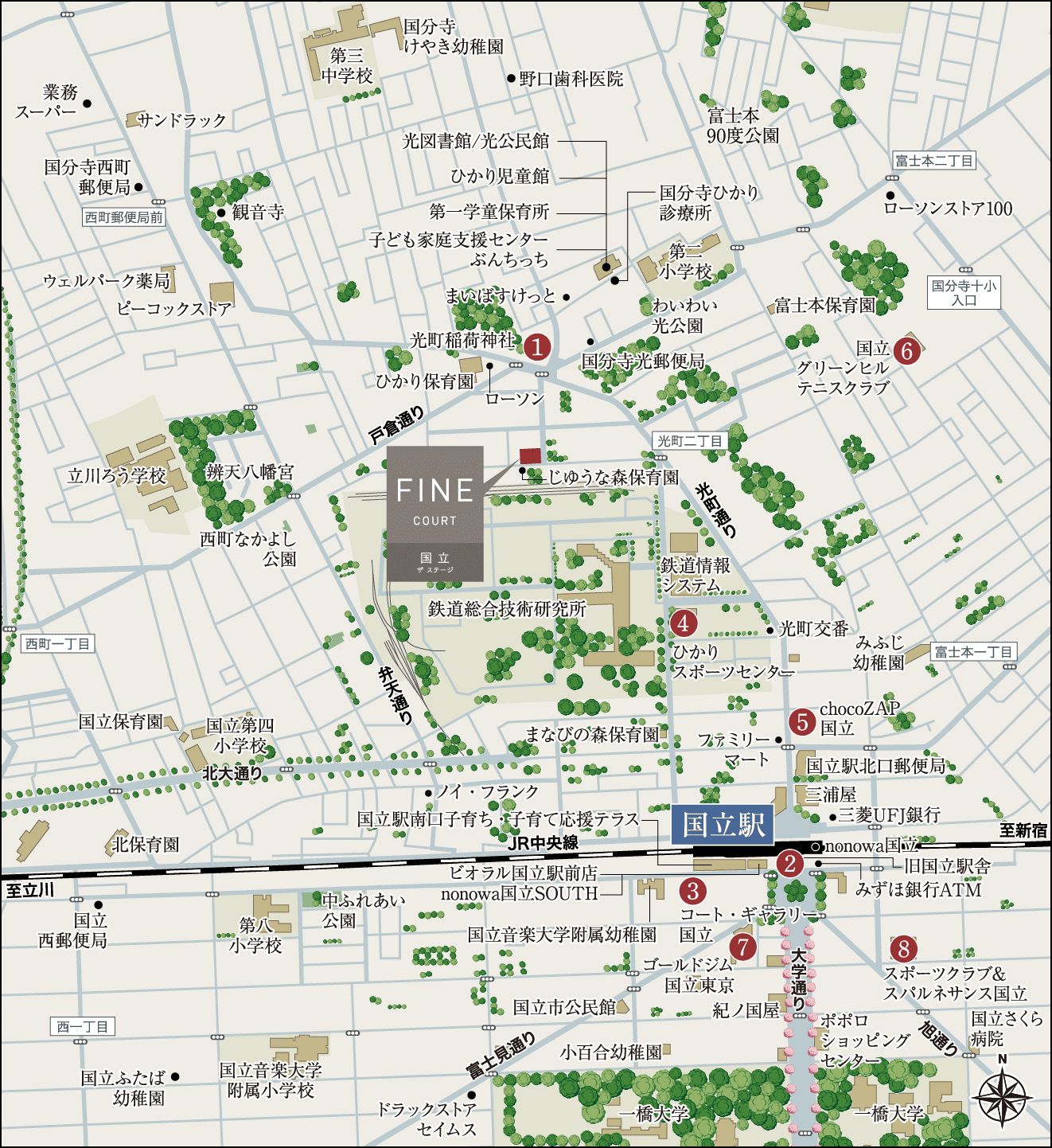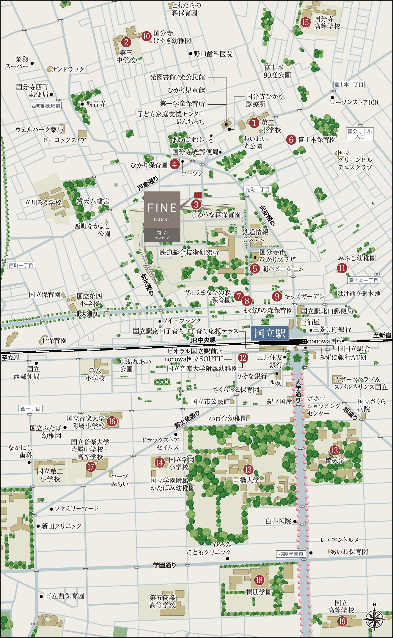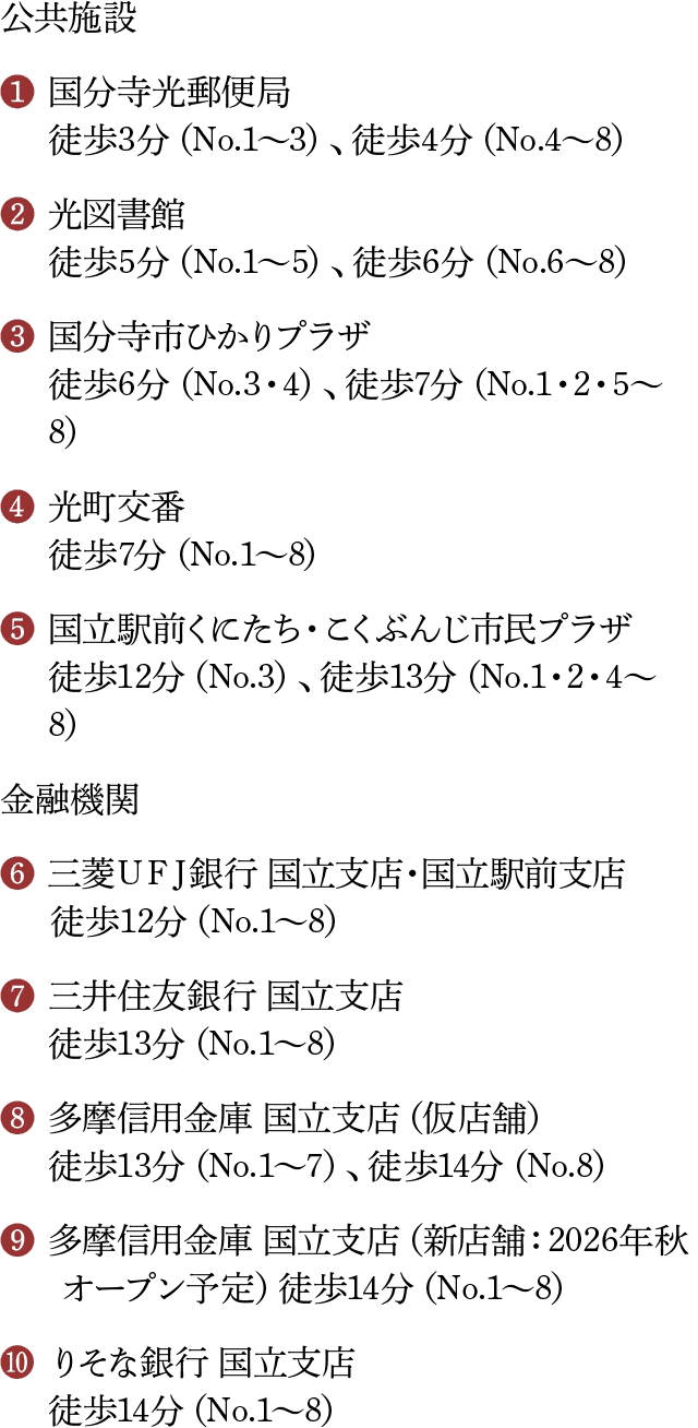 大学通り(歩道橋)/約2.4km(No.1〜8)※2022年3月撮影 JR「国立」駅周辺の気品ある商業施設を使いこなし、文教の風土に親しみながら、おおらかに、開放的に暮らす。静謐で開放的な環境のもと、優れた住環境が拓ける国分寺市光町が、新たなる邸宅の舞台です。 ライフインフォメーション 商業施設 公共施設・金融機関 教育施設 医療機関 公園 文化・スポーツ施設 *1:JR中央線「国立」駅徒歩12分(No.1〜8)※各施設等への徒歩分数は徒歩1分=80mとして算出し、端数は切り上げております。※掲載の情報は2026年1月現在のもので変更になる場合があります。※掲載の環境写真は、2025年12月・2026年1月に撮影されたものです。