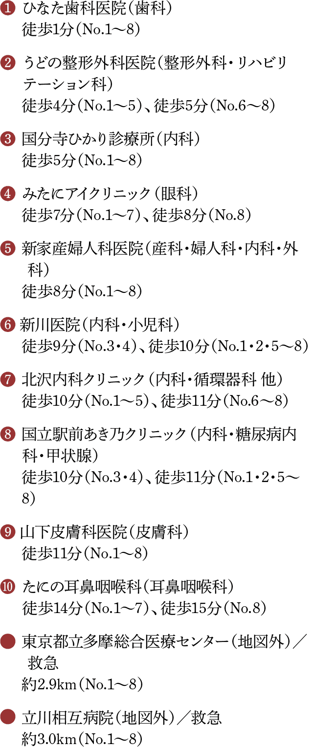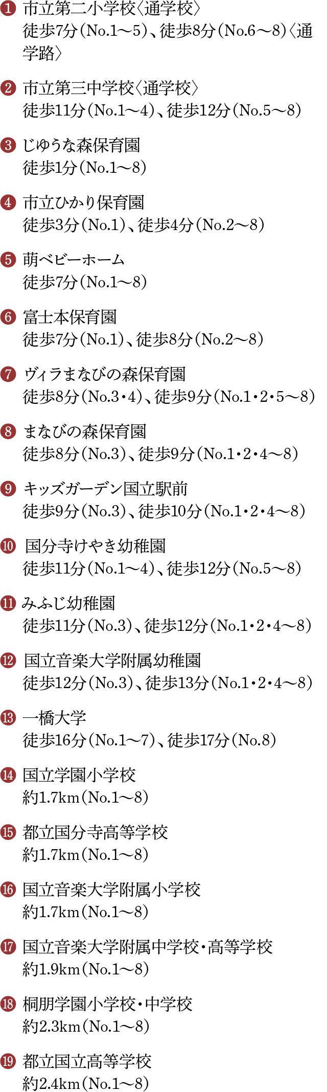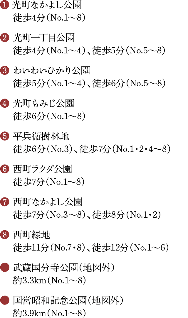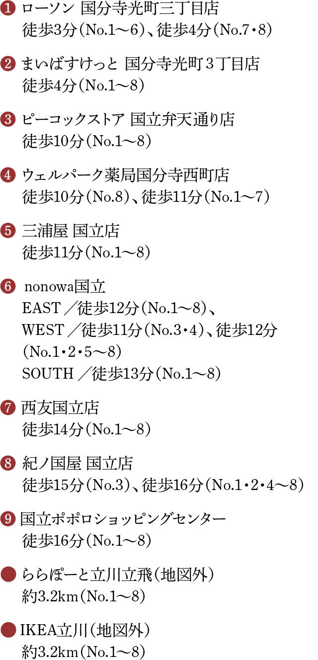 大学通り(歩道橋)/約2.4km(No.1〜8)※2022年3月撮影 JR「国立」駅周辺の気品ある商業施設を使いこなし、文教の風土に親しみながら、おおらかに、開放的に暮らす。静謐で開放的な環境のもと、優れた住環境が拓ける国分寺市光町が、新たなる邸宅の舞台です。 ライフインフォメーション 商業施設 公共施設・金融機関 教育施設 医療機関 公園 文化・スポーツ施設 *1:JR中央線「国立」駅徒歩12分(No.1〜8)※各施設等への徒歩分数は徒歩1分=80mとして算出し、端数は切り上げております。※掲載の情報は2026年1月現在のもので変更になる場合があります。※掲載の環境写真は、2025年12月・2026年1月に撮影されたものです。