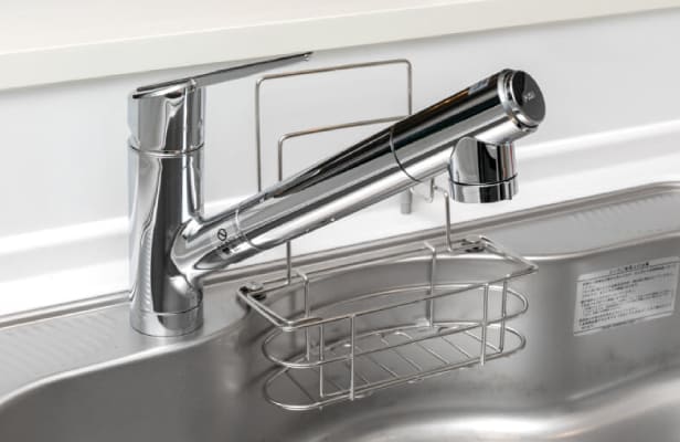 ノズルが引き出せ、浄水器を内蔵したハンドシャワー混合水栓を採用。大きなお鍋やシンクのお手入れに便利です。