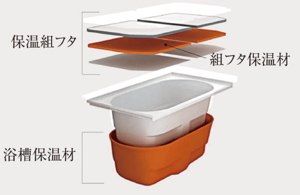浴槽保温材と保温組フタのダブル保温により、浴槽に張ったお湯が冷めにくい構造です。省エネに配慮しながら、心地よいバスタイムをサポートします。