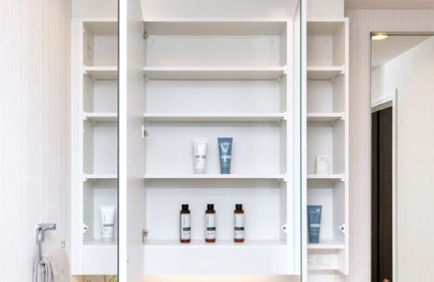 洗面室をスッキリ見せるため、三面鏡の裏側に収納スペースを設置。化粧品や洗面小物などをまとめて収納できます。