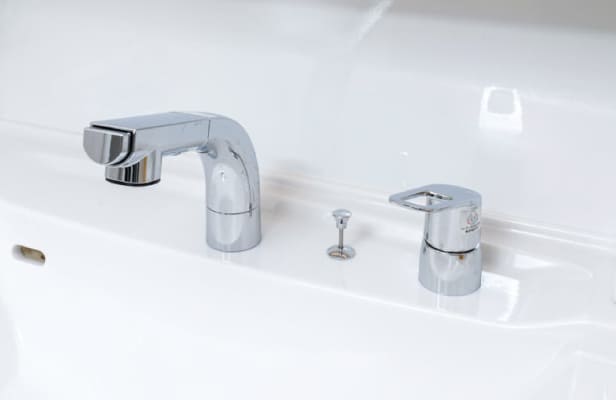 洗面台のシングルレバー水栓は、手前に引き出して使えるので、洗髪やボウルを洗う際に便利です。
